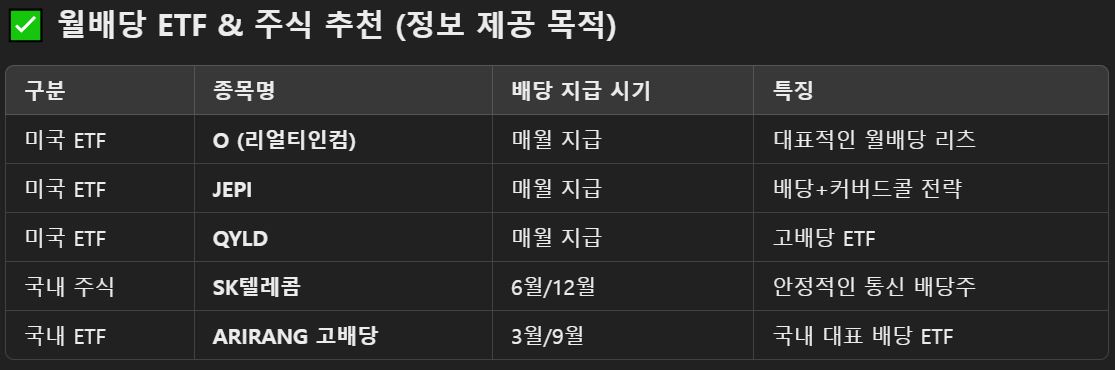 ✅ 1단계: 월배당 주식 또는 ETF 선정